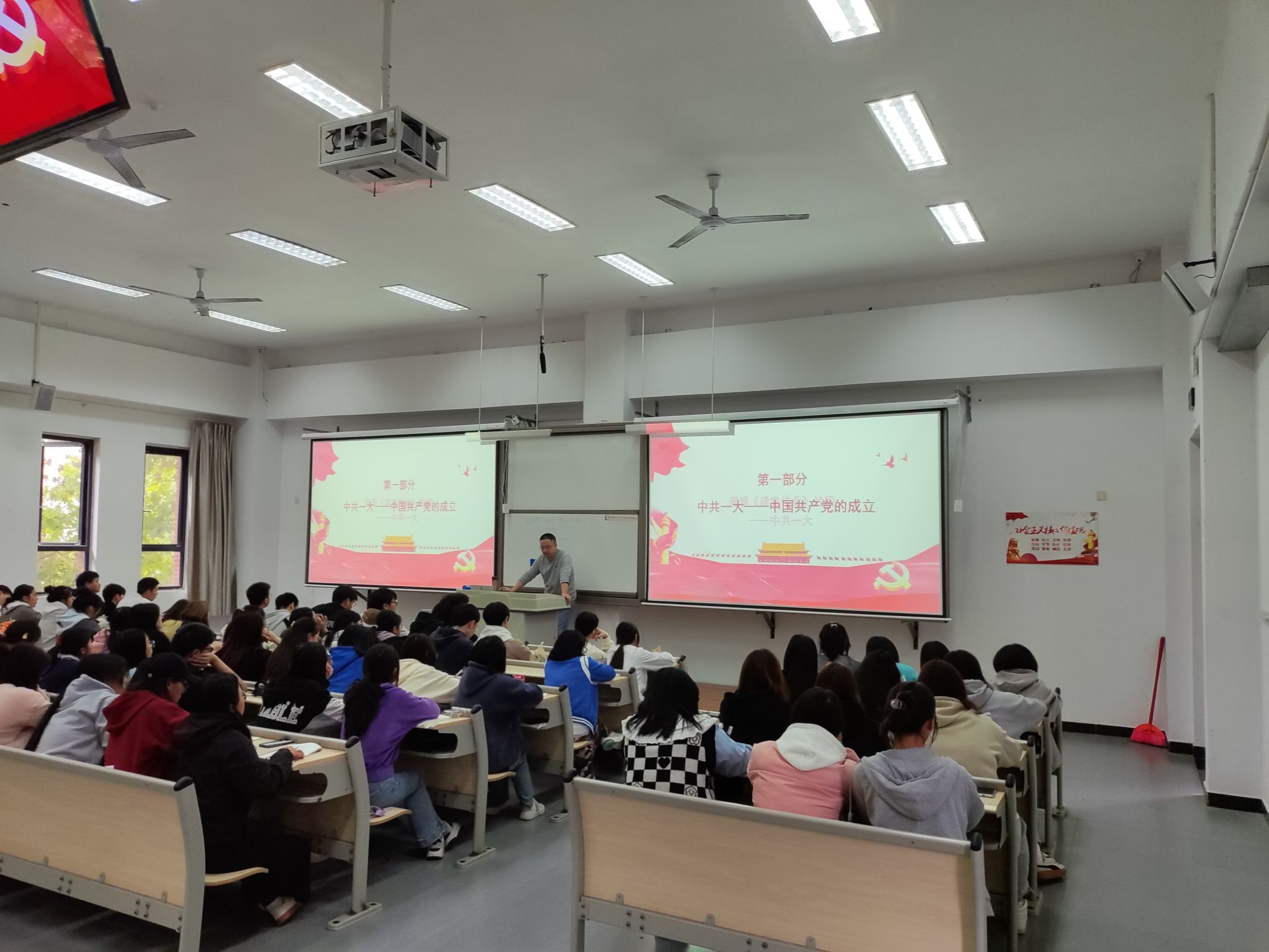 王伟才书记从中国共产党的成立、党的百年成就、党的二十大精神三个方面讲述,观看了部分影片,进而向同学们讲述了中国共产党的成立,同时讲了党的百年成就是什么,让同学们再一次感受党的魅力,带领同学们深入挖掘党的二十大精神内容。