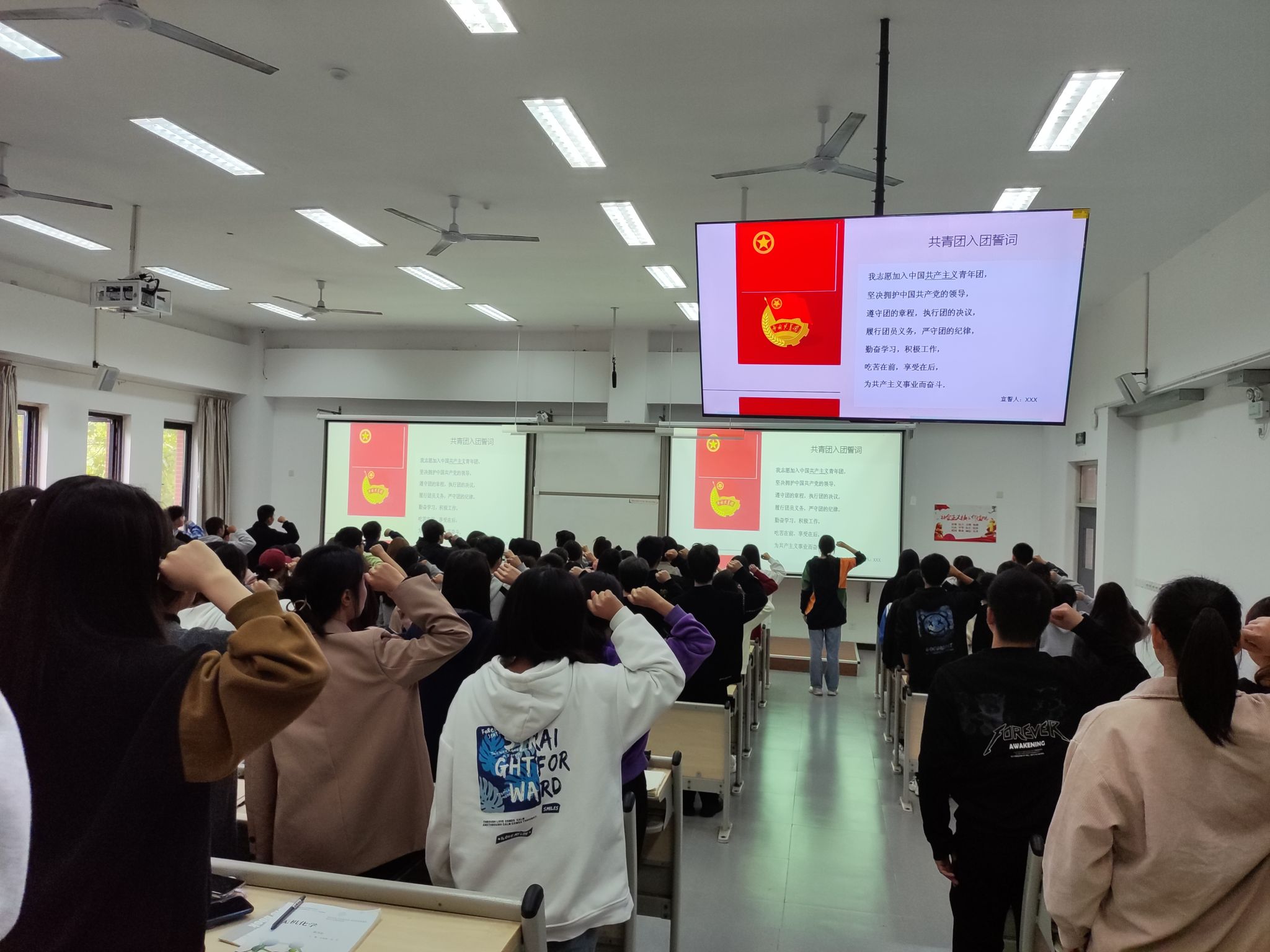 鲜敏老师讲述了学员考核标准,并由同学带领唱团歌,学习了入团条件的团员标准和支部建设,并表示在座的基本上为团员和班委,即寄予了新生们的希望和期待,希望他们积极建设班级,为班级做好模范作用。
