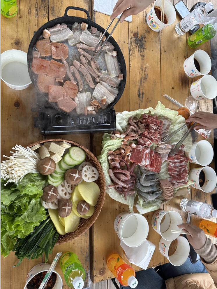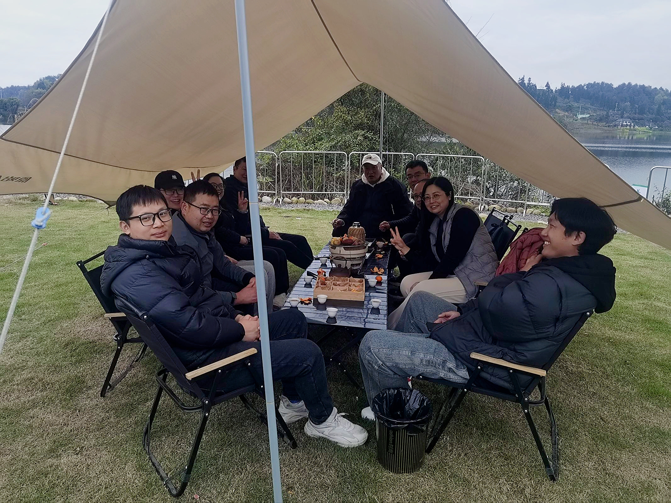 随后,大家前往湖边营地,开展了围炉煮茶与自助烧烤活动。围炉煮茶环节暖意融融,炭火轻燃,茶香四溢,教职工们围坐在一起,品茶闲谈、畅所欲言,在慢节奏的休闲体验中放松心境、滋养身心。温馨的氛围、惬意的时光,让大家充分感受到集体活动的温暖与乐趣,进一步增进了同事间的情感联结。自助烧烤环节则充满欢声笑语,大家分工协作、默契配合,有人清洗食材、有人烤制美食、有人传递器具,滋滋作响的食材、香气四溢的美味,搭配轻松愉悦的交谈,营造出热烈和谐的集体氛围。在美食与欢笑中,教职工们充分体验协作之乐、相聚之欢,团队协作意识与集体归属感得到进一步增强。